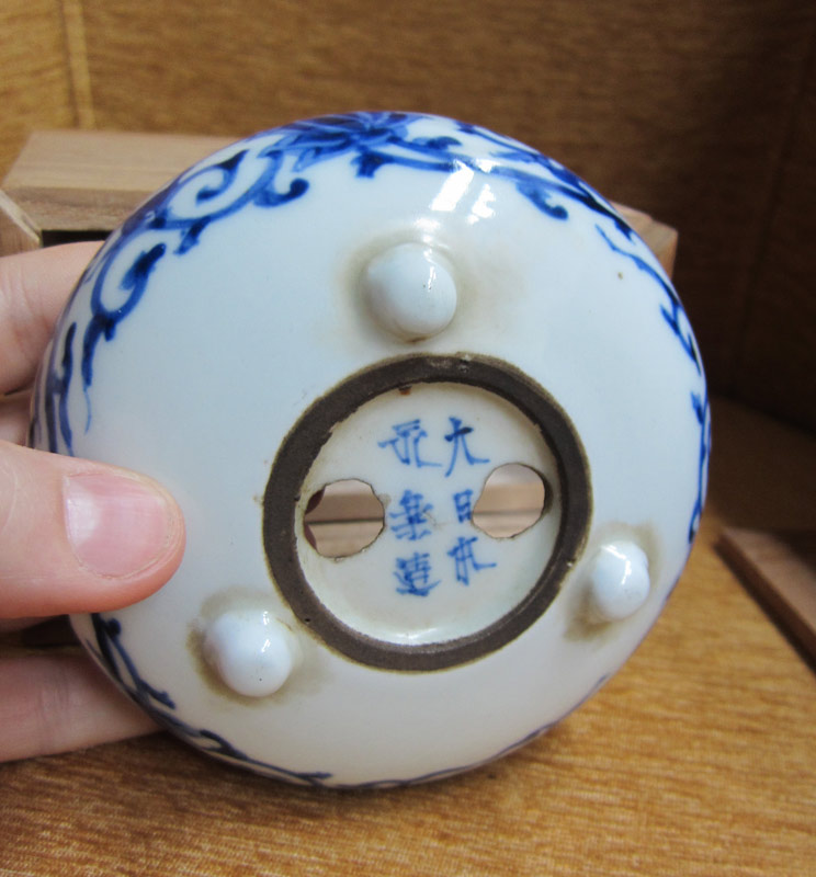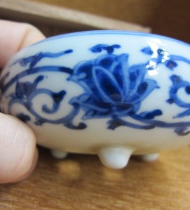 Inside was a porcelain pot. I took it out of its box and began to turn it over in my hands. It was clear that it had not begun its life as a bonsai container, but most probably started out as an incense burner. The two drainage holes in the bottom of the pot were definitely done some time after the pot had begun its life.