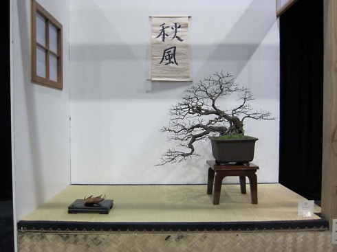 The tokonoma. English elm, fallen leaf and Scroll painted by a member.