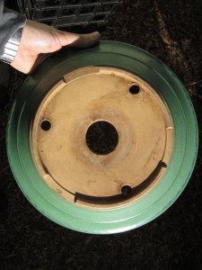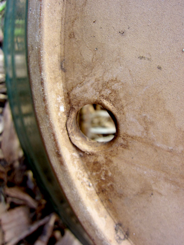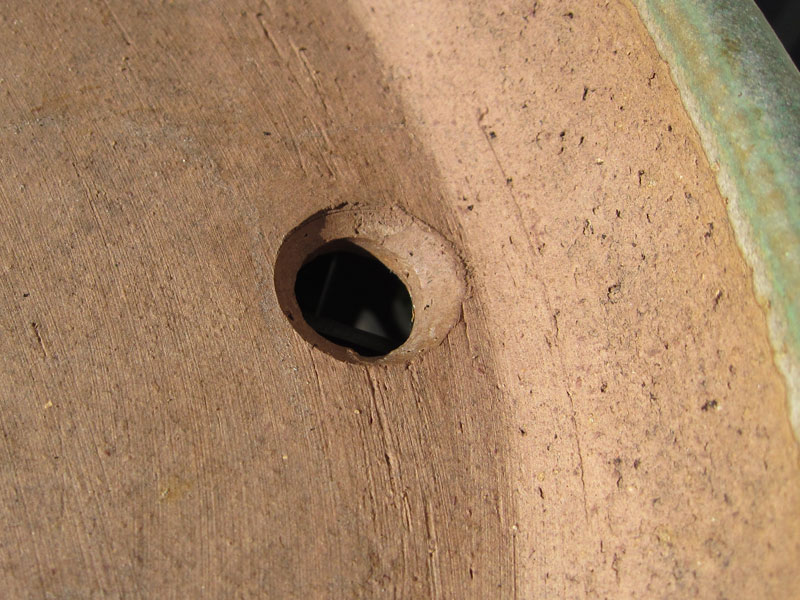 As you have seen from the previous photos these two pots at least on the surface seem very similar. What sets them apart for me is the smaller details. In fact detail is what really makes the difference for me when it comes to pots. In the next two photos I will look at one area of the pots. The drainage holes. Drainage holes are rarely seen when a bonsai is planted in a pot but when ever I purchase a pot I always try to look at the finish of these areas to determine quality. These details don’t necessarily mean it is a good pot or that it is a bad pot but I think that a pot that has well finished details will often set itself apart.