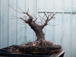 This is a fairly one way solution. In order to get the trunk to lie over I have had to cut off half of the nebari making standing the tree up in the future not really an option. That said I am sure you would agree that this clump or turtle back style transformation is definitely one that has improved the tree for the better. The tree has a long way to go and it will be interesting to see how the corky bark copes with the close soil contact, that said I think that in the future it will grow into an interesting tree. Depending on how it leafs out, I will most probably give it a prune and full wire some time in mid summer. Hopefully by this time next year it will have rooted enough along the trunk to get it into a more shallow pot and really start its journey as a bonsai.