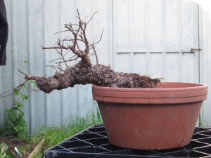 I had toyed with the idea of making this tree a semi cascade while it was potted but once I bare-rooted the tree and tried it in a few semi-cascade positions I wasn’t entirely convinced. I spent some time tilting the tree this way and that, changing fronts, imagining grafted branches until I finally settled on a design.