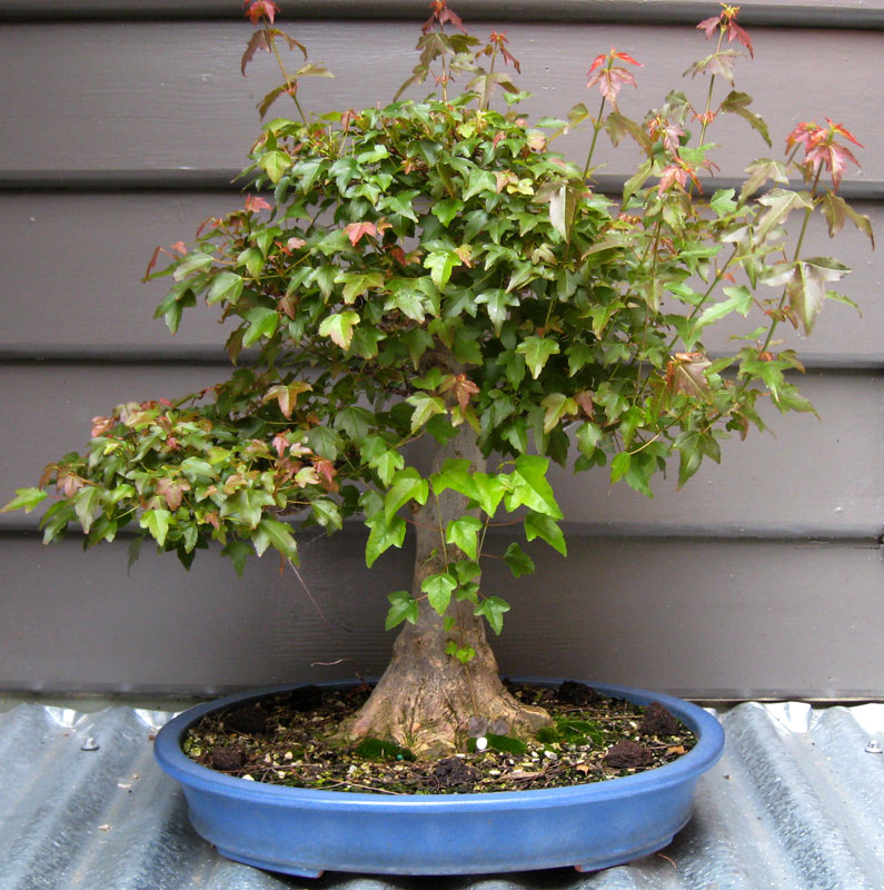 This year has seen some dramatic changes to my bonsai. The most major of these was moving house and gaining some backyard space. My trees previously were kept in amongst a lush garden. On one hand this was good in that my bonsai were quite sheltered and there was a good micro climate in which to grow amongst. The down side was that I could never really rid my trees of pests as once the garden was infected everything was. As a result my trees ended up with a number of pest problems. Now I have moved I hope to rid them of these problems, which brings me to the subject of this post, my Trident Maple.