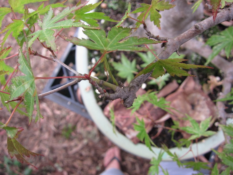 I also re-potted the tree and found a lump of old akadama in the center of the root ball. I bare rooted and picked all the old soil out of the root-ball. Almost immediately after the re-potting the vigour of the tree improved and I was rewarded with strong growth which helped the approach grafts to take. In the above image you can see the grafts emerging from the underside of each branch.