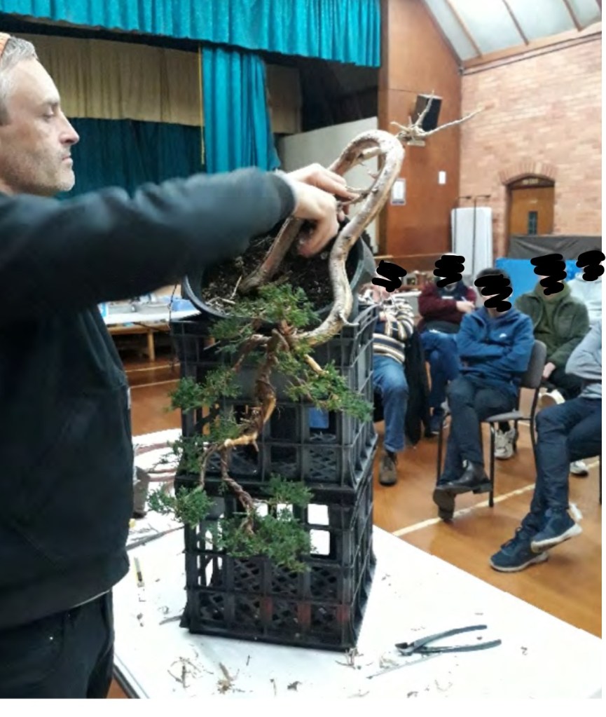 The tree came up pretty well and was a good example to discuss changing the flow or direction of branches as i worked. Towards the end of the demo there was a lot of concern about the chances of ever getting it into a bonsai container as it was in a large growing pot………