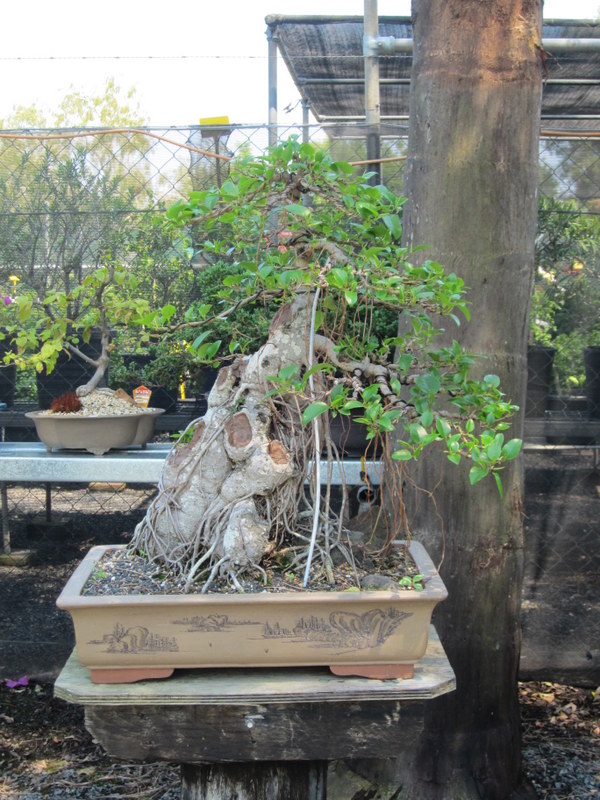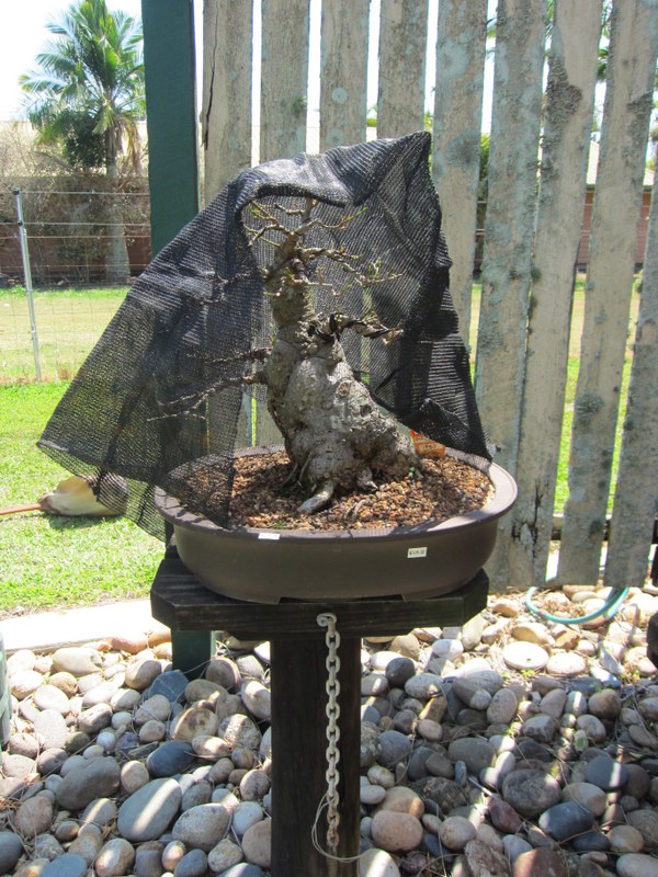 One such technique that seems to be more specific to hotter regions such as Brisbane that the owner, Tess talked about was the shading of fig trunks that have recently been defoliated. Tess showed me a couple of examples of figs that had died back on the trunk after having their trunks exposed to full, hot sun after defoliation. She had come up with a number of ways to shelter freshly defoliated figs from the sun that ranged from moving them to shady areas and or making covers for them such as the one below which I think was made from fly screen. Admittedly i dont grow figs down here in Melbourne but its an interesting technique none the less incase i do decide to grow one. The sun can be very hot down here too and i can see the logic in shading trunk that would otherwise be covered by foliage.