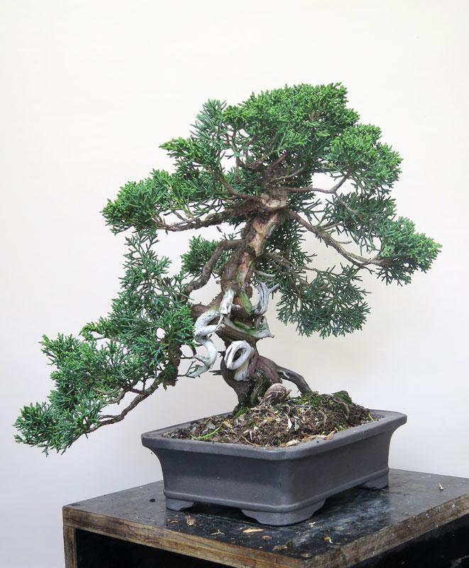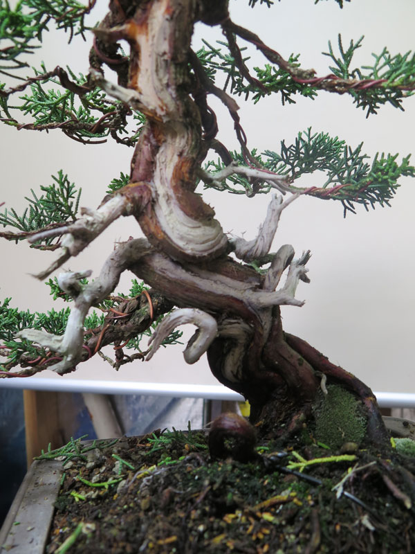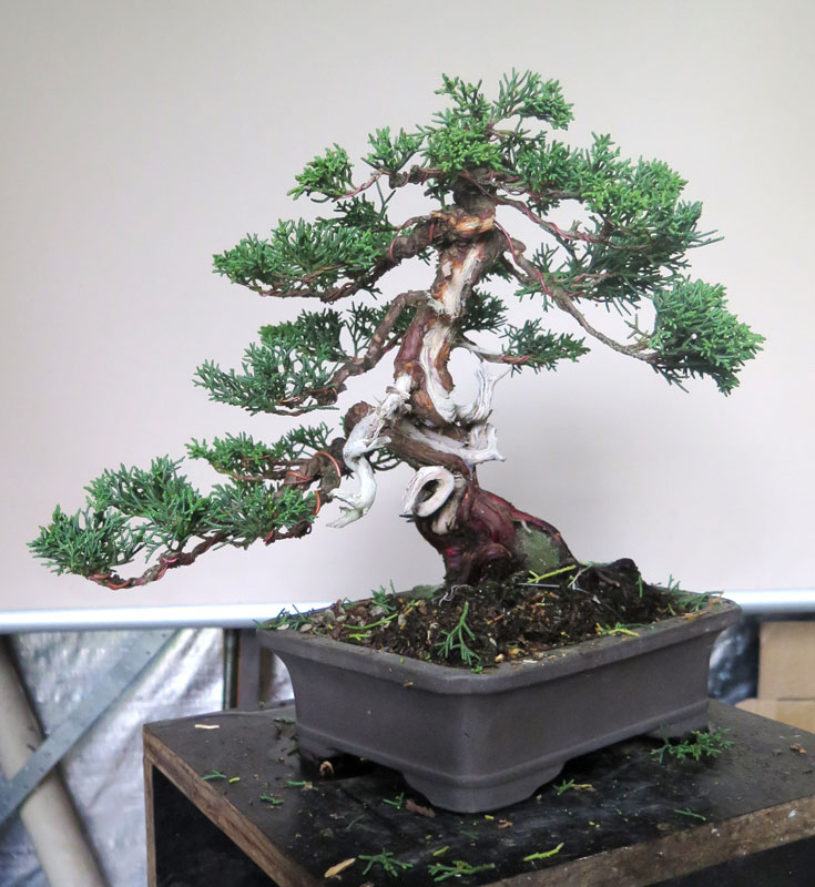 The tree itself was a procumbens Juniper and had some wild and unusual movement, including a loop the loop feature. I began by removing unnecessary branching and making shari that highlighted the movement of the trunk-line.