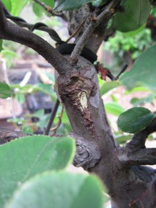 After I finished placing the graft on the trident maple I decided it was also a good time to clean up a graft on a Chinese Quince from last season. If you look closely you can see the difference in thickness between the grafted branch and the stub that use to be connected to the parent whip.