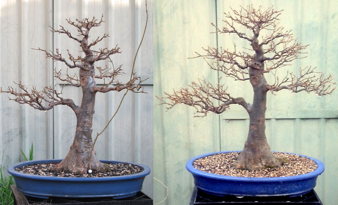 The reason I had been debating whether or not to make this change lay in the nebari. In the 2011 picture you can see that the nebari’s spread has a somewhat flat side to it which was facing the front. When it was rotated this formed an angle which is a little strange although there are a few good results of this change. First the slight thickening about 2/3rds of the way up disappears and there is more movement in the trunk. Also the branching is better from this new front.