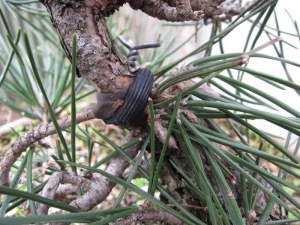 Here you can see some new roots being grafted to a Tsuga trunk. The roots have been wrapped in cloth and are both watered and fed as if in a standard pot.