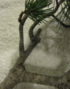 Below are a few pics I took while playing around on a branch removed from a white pine I have recently styled. It’s not really the perfect example as it’s not part of a dense canopy and I can easily get the tools in to make the cuts, but it shows the resulting cuts nicely.