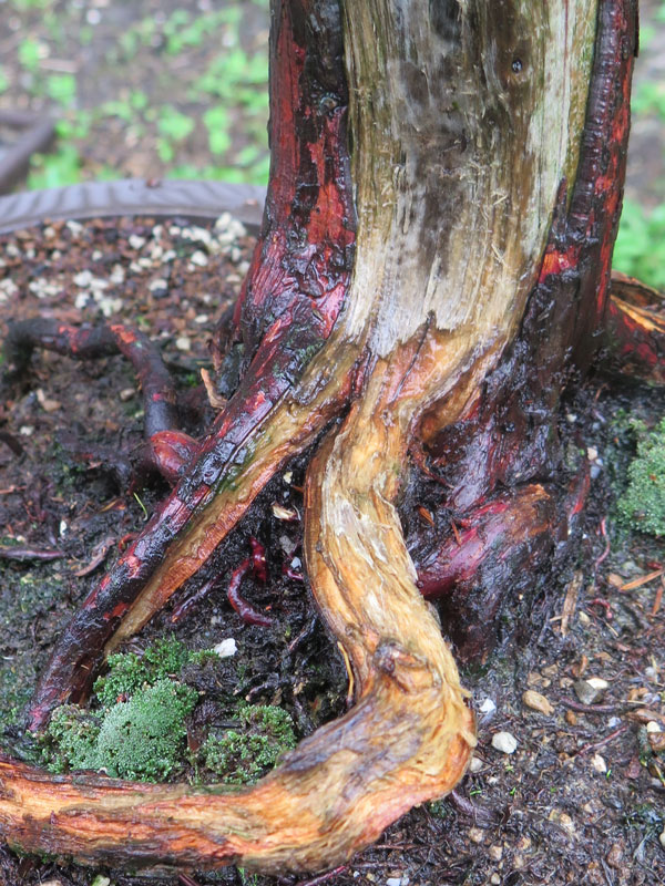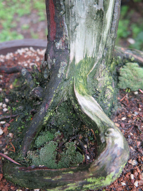 While I had the tree on the bench i also thinned and shaped the live veins a little on the rear of the tree to further define them and ideally encourage them to ‘plump up’. Afterwards I gave the shari areas and jins a good fresh coat of lime sulphur and added some moss while I waited for things to dry. As I was applying the moss i also pulled and tied down the root on the left side that was hovering above the soil surface which I think was an easy improvement to make.