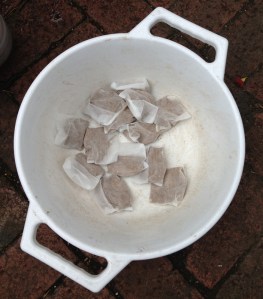 To try to combat that this year I am trying using my ingredients loose inside tea bags. The idea is that they will be much easier to re-wet each watering and hopefully break down much more quickly and hence feed my trees better.