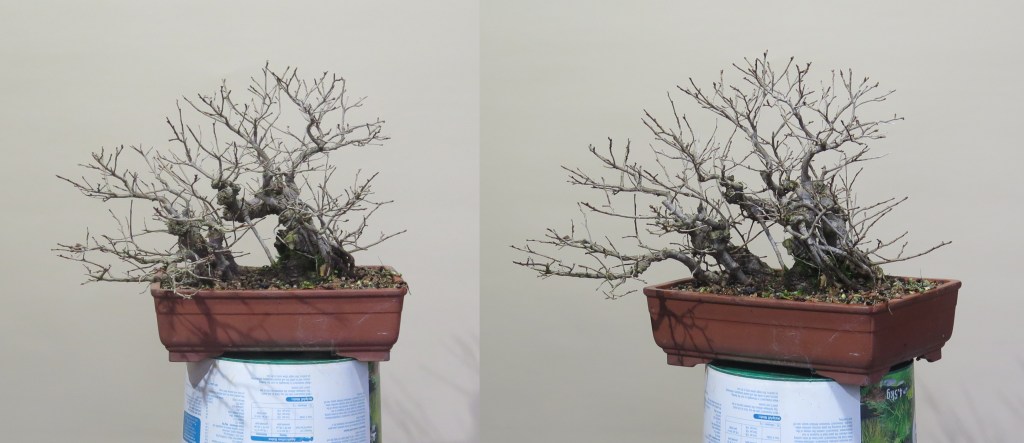 Pretty sure (according to my detailed and hazy recollection) that this tree was re-potted some time in the last two to three years. It hazards a guess then as to why I chose to pot it with this front at the time?
