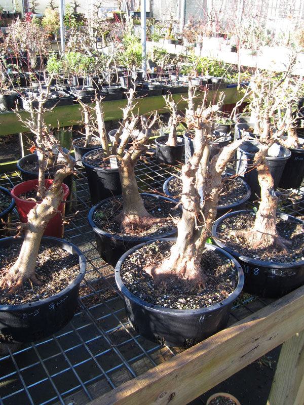 When out of the ground, the most important cuts to the roots are in removing those that are downward growing and scarring the base of the trunk to further thicken the base; and with this stock, this has been done with great results. In fact, I was so impressed with the quality of the material I put my name on a couple that might come out of the ground in the next couple of years.