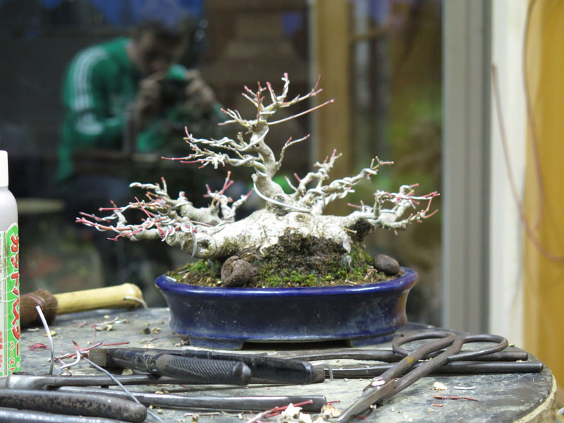 One of the other trees that caught my eye was a maple with an enormous nebari. The bonsai was being worked on by one of the apprentices who was wiring all the branches to the tips.