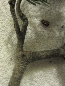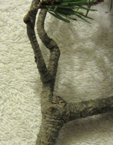 Below are a few pics I took while playing around on a branch removed from a white pine I have recently styled. It’s not really the perfect example as it’s not part of a dense canopy and I can easily get the tools in to make the cuts, but it shows the resulting cuts nicely.