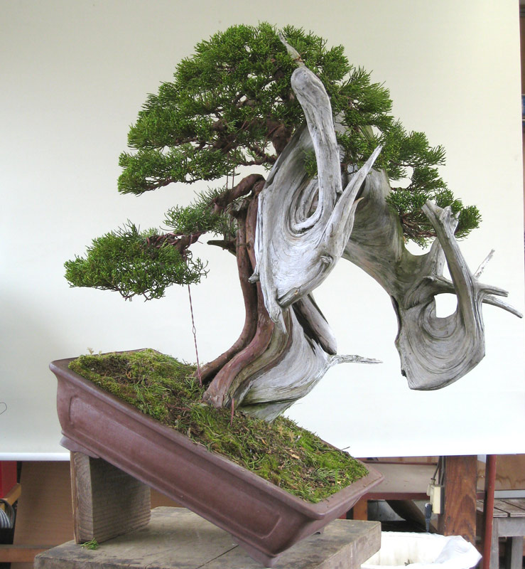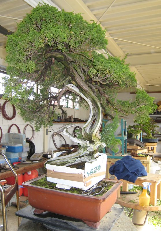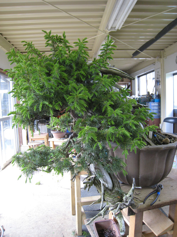 The tree was wired to the tips and I positioned all the branches and foliage. I then showed the results to Oyakata.