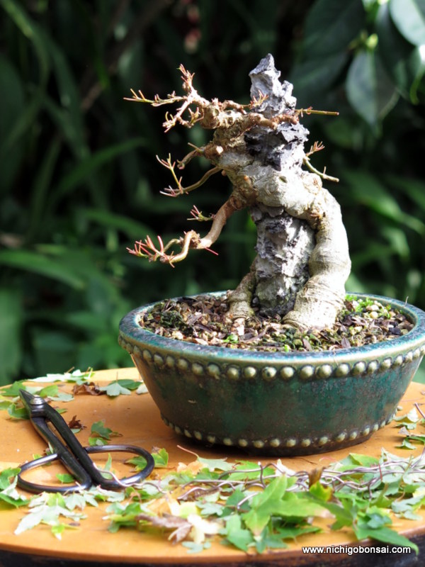 I defoliated the tree and removed the old wire setting it up for its next flush, some new buds and further ramification. Its a very nice tree and I think will develop into something that will always have a space on my benches.